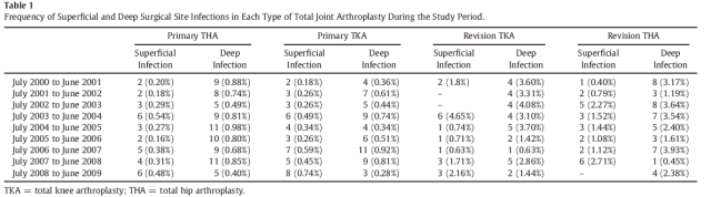 经机构审查委员会同意,我们回顾了机构数据库中从2000年7月1日到2009年6月30日所有初次和翻修关节置换患者。我们按照第九版国际疾病分类 (ICD-9-CM)查询编码,分别查询相关编码以鉴别患者是否罹患SSI,包括以下编码:996.66 ——内置关节假体引起的感染或炎症反应,996.67——其他骨科内植物引起的感染或炎症反应,998.51——术后感染性血肿以及528.3——术后蜂 窝织炎和脓肿。所有入院时已经伴有SSI的关节置换患者均排除研究。如果患者一次住院期间需要灌洗和清创等多次手术来控制感染,我们将其列为一次SSI过 程。灌洗和清创手术不被列为翻修手术,但其他任何操作如假体周围骨折的固定术则被列为翻修手术。所有含有上述CD-9-CM编码的患者均回顾其临床病例以 鉴定其是否罹患符合疾病预防和控制中心(CDC)定义的SSI。本研究仅针对行相关手术后1年内的SSI,伤口并发症仅在最终导致假体周围感染(PJI) 才被诊断为深部SSI。