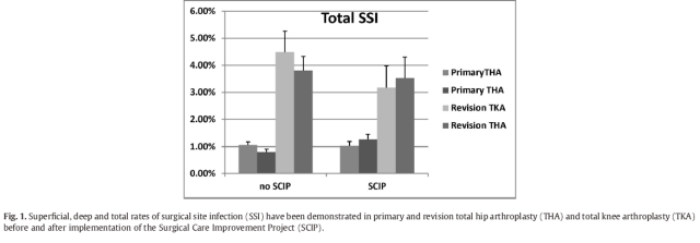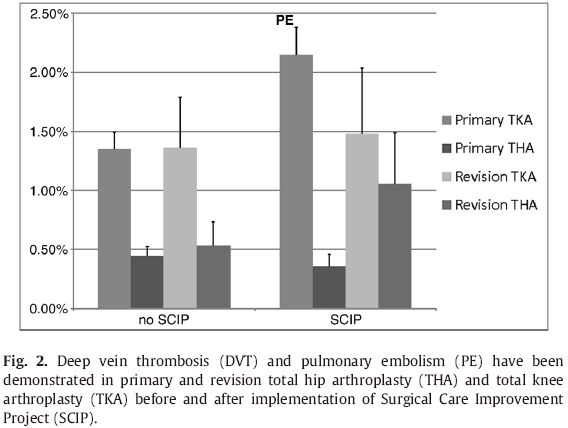 我们使用Fisher检验比较实施SCIP前后的VTE和SSI发生率的差别,同时使用回归分析以校正由不同类型手术(初次或翻修)、不同关节(膝或髋)和不同SCIP措施导致的结果误差。P值小于0.05被认为有统计学差异。