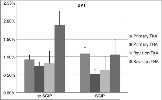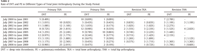 表2显示不同类型关节置换DVT和PE的 发生率。实施SCIP后DVT的发生率从0.92%降至0.83%,但无统计学意义(P = 0.51)。而PE发生率由0.87%升至1.30%,具有统计学意义(P = 0.002)。图2比较实施SCIP后不同类型关节置换DVT和PE的发生率。考虑到DVT和PE都是独立的VTE事件,因此实施SCIP后VTE总发生 率由1.80%升高到2.14% (P = 0.07),多变量分析提示排除不同关节手术类型影响后,实施SCIP将导致PE的发生率明显增高(统计推断值0.34,标准差 0.13,P<0.001)