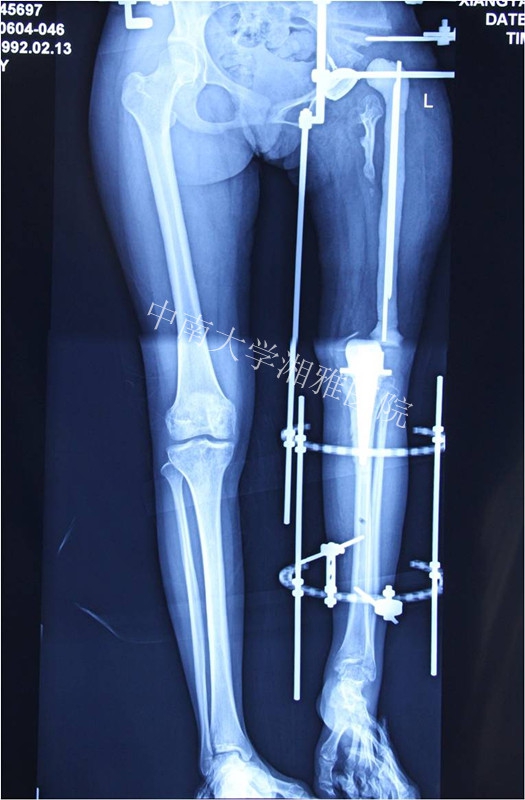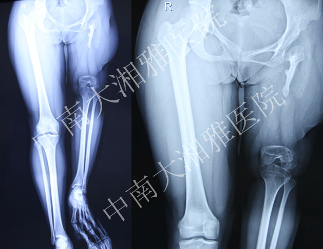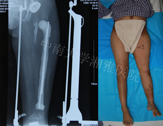 出生后8个月出现左股骨中段骨髓炎,在当地医院予以保守治疗,1年后好转。其后出现左大腿停止发育,左下肢短缩,行走活动不能。2012年10月至中南大学湘雅医院门诊求治,摄片发现左股骨未发育,收入住院。