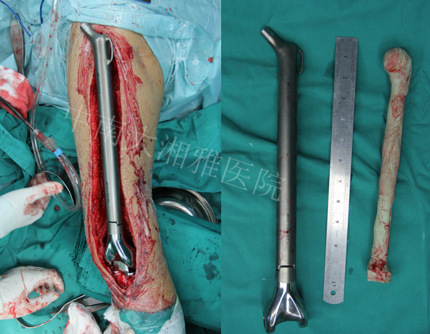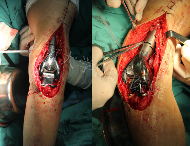 2013年6月安装胫骨侧假体,自制股骨骨水泥占位器占位,继续延长