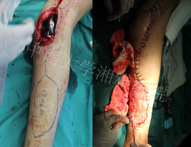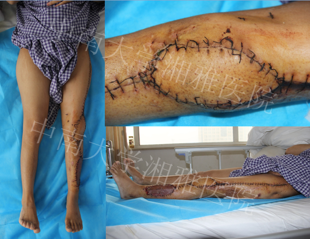 左大腿可见1*2cm²伤口疤痕,无红肿、窦道流脓