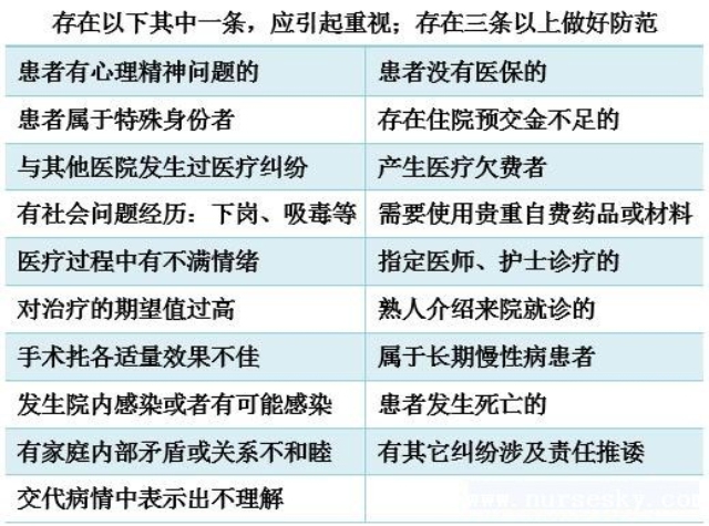 如果存在其中一条,应引起重视,做好患者沟通、管理工作;如果具备三条以上,不仅做好沟通、管理工作,还要通告全科做好防范。