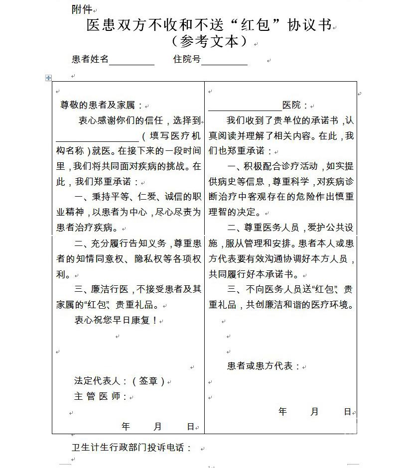为确保“不收不送红包”的医患书面承诺能够落实,国家卫生计生委要求各级卫生计生行政部门加强监督检查,统一设立投诉电话。