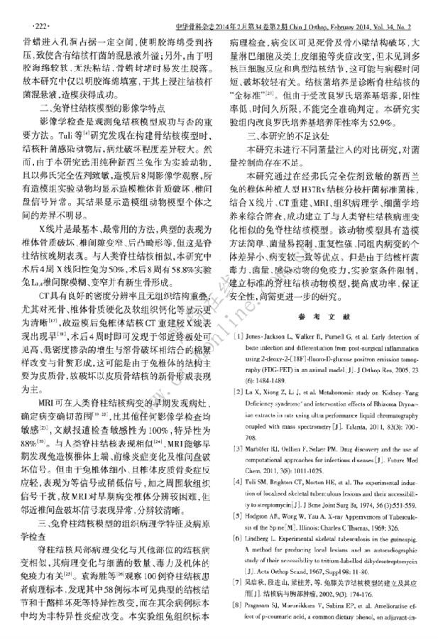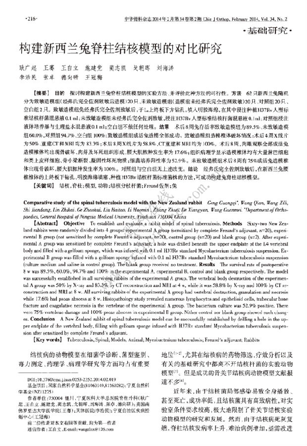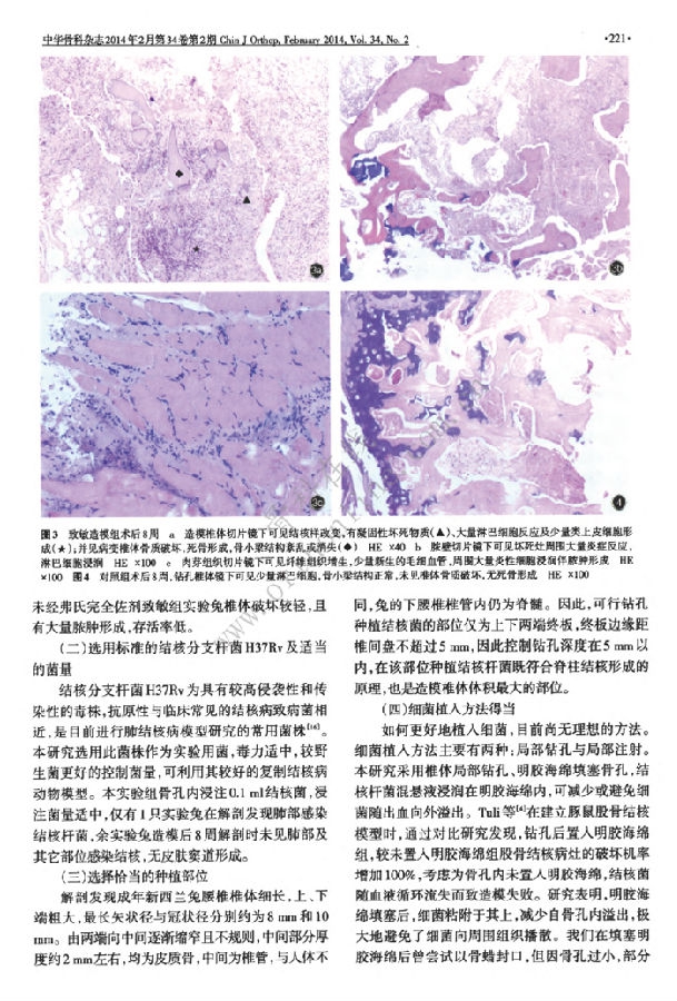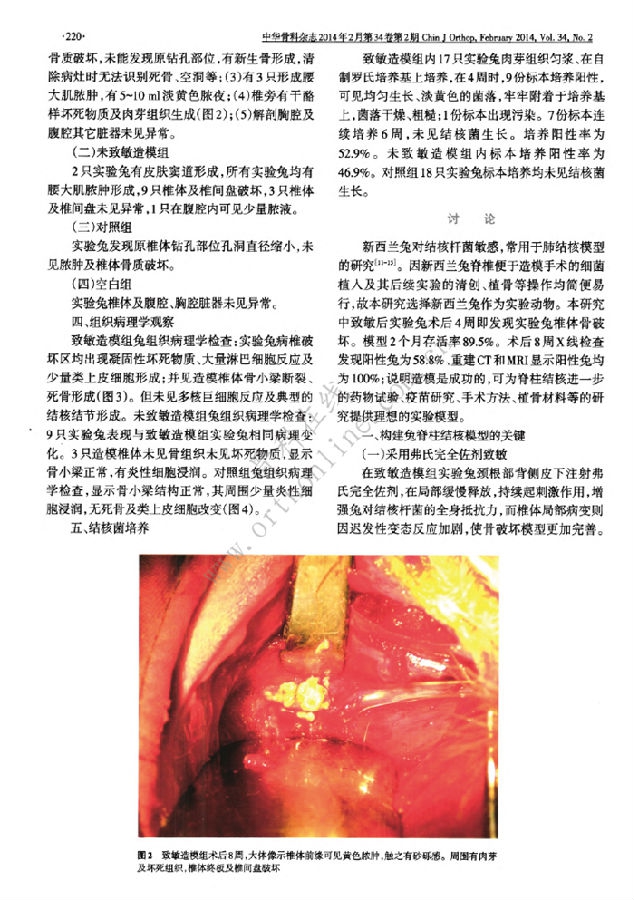 结论:经弗氏完全佐剂致敏后,在新西兰兔腰椎椎体的上终板下钻孔、明胶海绵填塞、种植H37Rv结核杆菌标准菌株的方法,可成功构建兔脊柱结核模型.