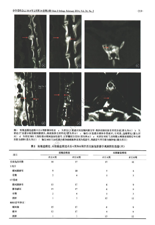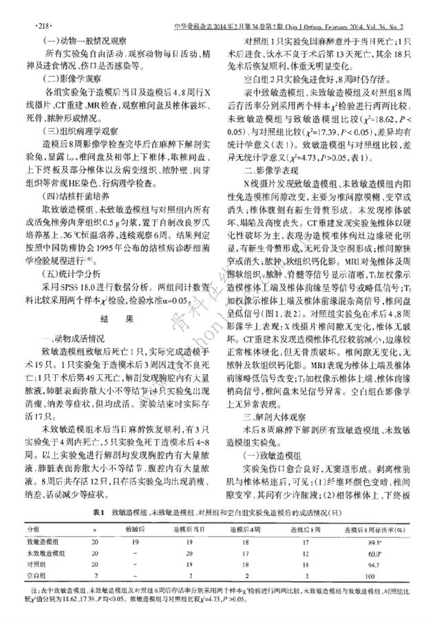 结果:术后8周兔存活率致敏造模组为89.5%、未致敏造模组60.0%,对照组94.7%、空白组100%;致敏造模组成活兔造模全部成功.致敏造模组造模椎体破坏情况:术后4周X线片为50%、重建CT和MRI均为83.3%;术后8周X线片为58.8%、CT重建和MRI均为100%.术后8周,肉眼观察全部成活兔造模椎体均出现骨破坏、肉芽及坏死组织形成,腰大肌脓肿发生率为17.6%;组织病理学显示造模椎体均有大量淋巴细胞和类上皮样细胞、骨小梁断裂、凝固性坏死物质;细菌培养阳性率为52.9%.未致敏造模组术后8周有75%成活兔造模椎体出现骨破坏,腰大肌脓肿发生率为100%.对照组与空白组无上述改变.
