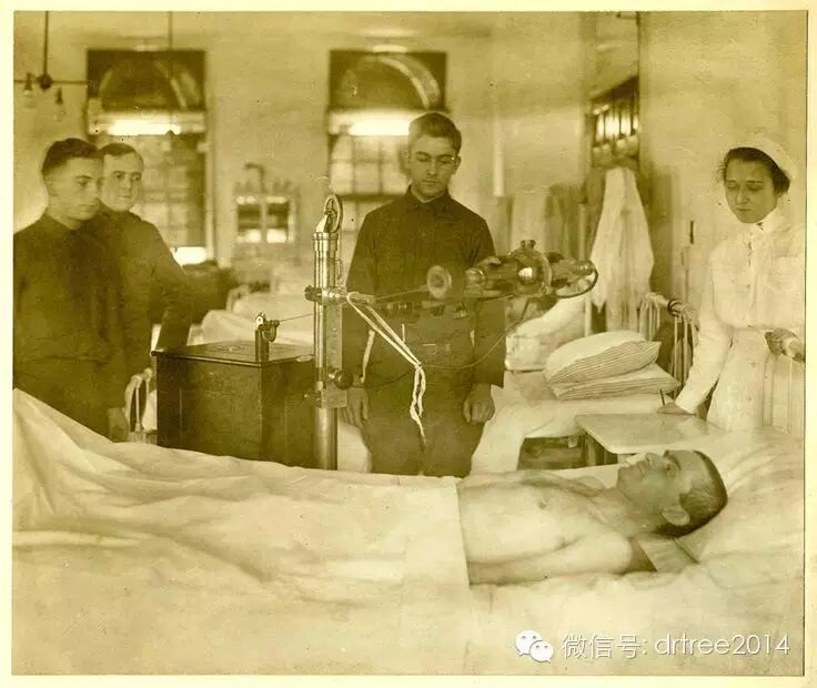 (X线检查出现没多久,人们就开始琢磨如何实现X线设备的“便携性”。这是1918年最早一代的移动X线设备)