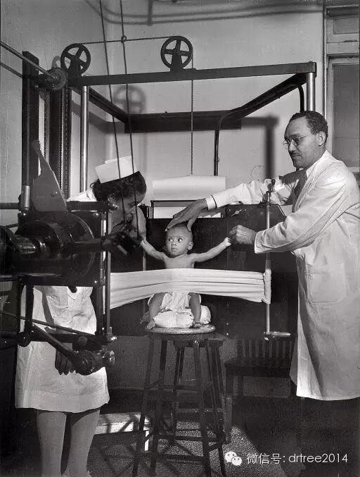 (1942年,医护人员给一名婴儿做X线检查。上个世纪起,人类从很小就开始接触X线)