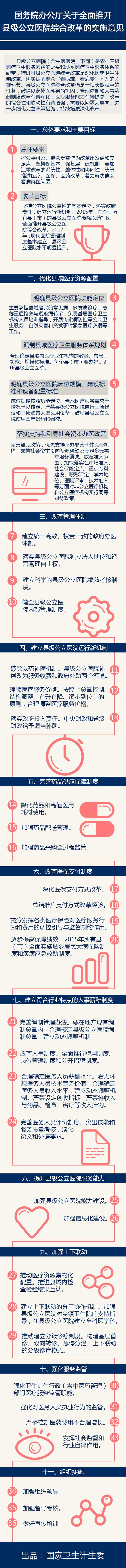 中国政府网8日发布的国务院办公厅《关于全面推开县级公立医院综合改革的实施意见》提出:2015年,在全国所有县(市)的县级公立医院破除以药补医,以管理体制、运行机制、服务价格调整、人事薪酬、医保支付等为重点,全面推开县级公立医院综合改革。2017年,现代医院管理制度基本建立,县域医疗卫生服务体系进一步完善,县级公立医院看大病、解难症水平明显提升,基本实现大病不出县,努力让群众就地就医。
