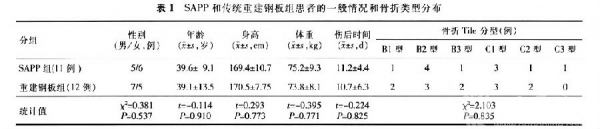 统计结果显示,虽然两组之问手术时间、出血量、术后复位评分的差异均无统计学意义,但SAPP组钢板放置时间明显较传统重建钢板组缩短,证明了SAPP更加简单易用。而在TileB型骨折中,SAPP组手术时间和出血量均有所减少,但手术时间两组比较无统计学意义,出血量则有统计学意义。在一定程度上反映了新型的SAPP可以帮助进行复位,从而易化手术及减少出血量,对术者有一定的帮助。但对于TileC型骨折帮助不大。