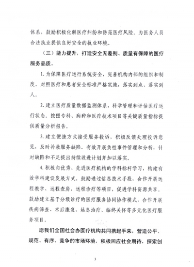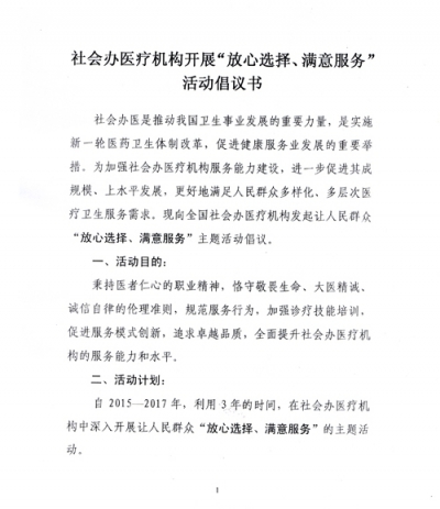 日前,国家卫计委医疗管理服务指导中心和中国非公立医疗机构协会联合发布倡议书,呼吁在社会办医疗机构中深入开展让人民群众“放心选择、满意服务”主题活动,加强社会办医疗机构服务能力建设,进一步促进其成规模、上水平发展,更好地满足人民群众多样化、多层次医疗卫生服务需求。