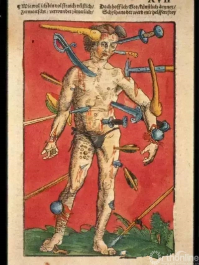 (一副中世纪有关创伤的医学绘画。人是很脆弱的,一旦受伤,身心俱损、性命堪忧。我做过多年的创伤救治工作。我觉得,创伤的威胁可以来自于四面八方,而能够保护我们的,唯有预防。不受伤,才是王道。)