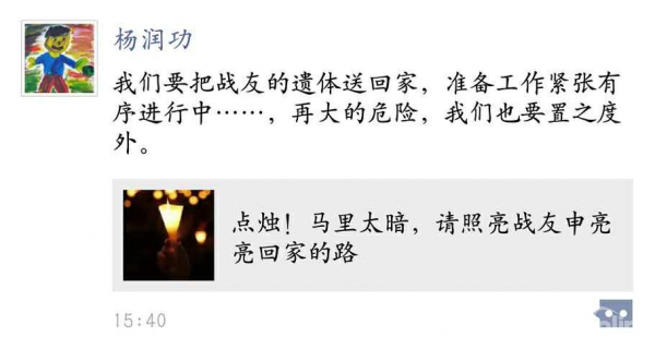 直至北京时间6月4日15:40,杨润功教授在奉命出征马里两天后终于有了第一条微信朋友圈状态:“我们要把战友的遗体送回家,准备工作紧张有序进行中……,再大的危险,我们也要置之度外。”