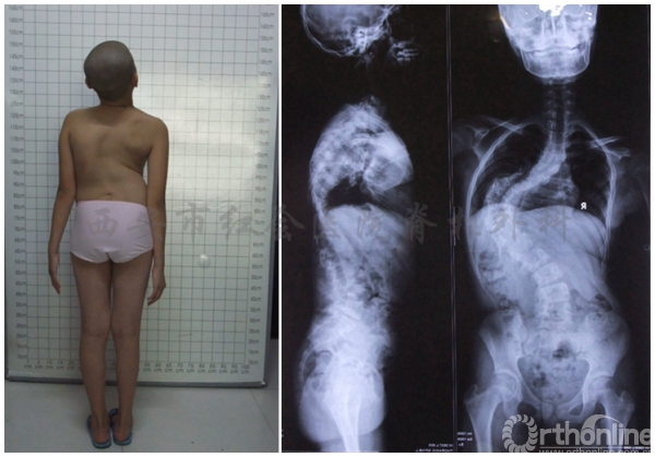 脊柱侧凸患者的外观大体照及X片显示扭曲的脊柱及畸形的胸廓