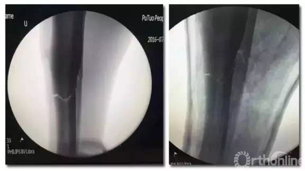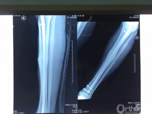 正常术前准备后,手术在透视下按计划顺利进行。术中扩髓11.5mm, 使用直径10mm、长度400mm髓内钉进行内固定。由于腓骨没有移位,腓骨切开固定后有可能延长胫骨愈合时间,基于这方面担心,专家团队决定不对腓骨进行固定。为将对肌肉的刺激降到最小,专家们使用近端螺钉埋头技术,接近完美的使钉头尽可能与皮质水平。