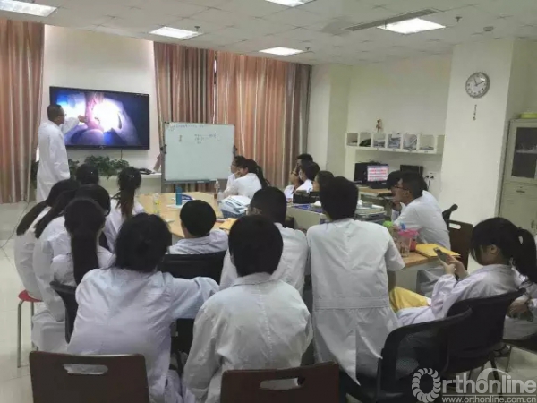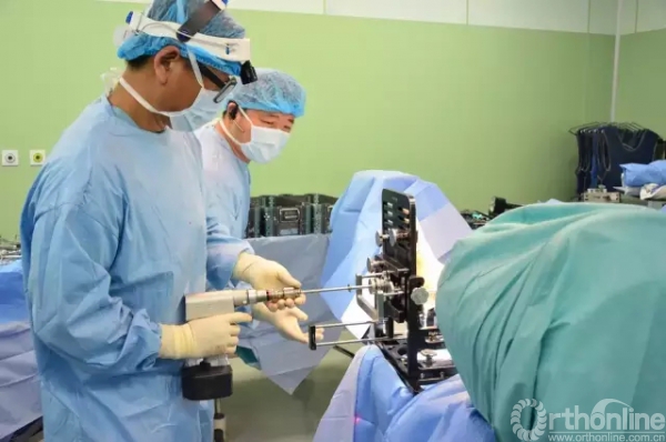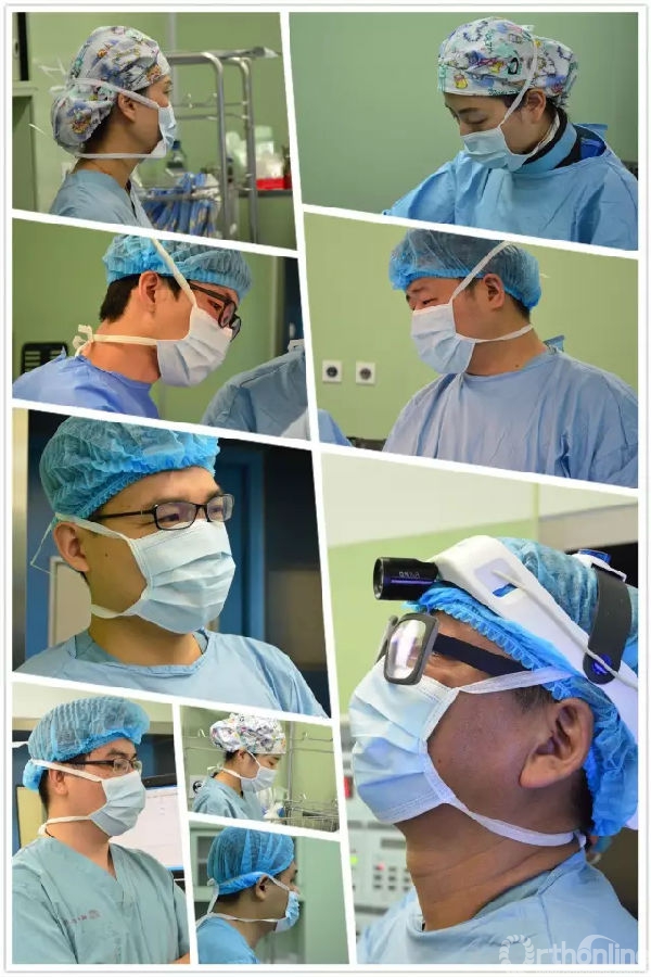 2016年7月25日上午瑞金医院北院1号手术间手术紧张有序地进行着,由徐向阳主任主刀,胡牧、郭常军、徐财军医师担任助手,张海军医师负责术中透视,苏丹为器械护士,施雨婷为巡回护士,杨利英护士长全程协调,麻醉师王智渊保障手术顺利进行,所有人通力协作、配合默契。同时在技术人员协助下实现手术实况转播,其他医生在病区医生办公室观摩手术。