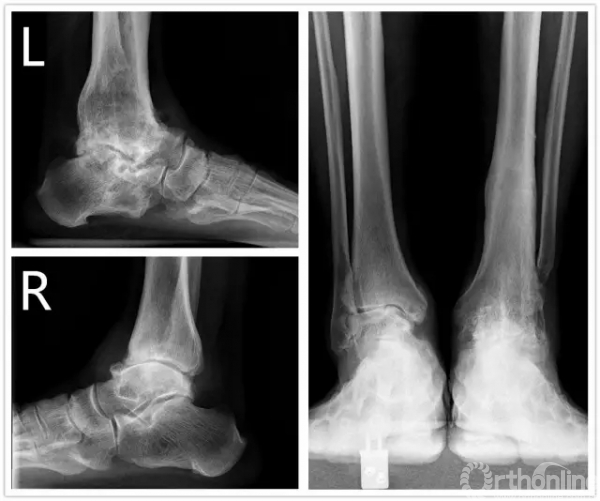 方老伯,今年67岁,2006年7月他因左侧踝关节严重骨关节炎到上海瑞金医院就诊,当时刘津浩副主任考虑其踝关节和距下关节都已经出现严重的骨关节炎,无法保留关节,于是对其进行了胫距跟双关节融合手术。手术后方老伯恢复良好,如期达到骨性融合。2年后,方老伯右侧踝关节开始出现肿胀疼痛,日夜反复发作,直到2010年2月,他无法忍受,再来医院就诊,拍片后发现他右侧踝关节也出现明显骨关节炎。此时正值瑞金医院足踝外科全面发展时期,足踝外科的新理念、新技术已经引入瑞金医院,当时学科带头人徐向阳主任认为该患者左侧踝关节已经行融合手术,右侧不适宜再行融合手术。于是徐主任主刀、刘津浩副主任和朱渊医师担任助手,顺利为方老伯进行了踝关节STAR假体置换术,手术后保持随访康复良好,又恢复了往常的劳作。