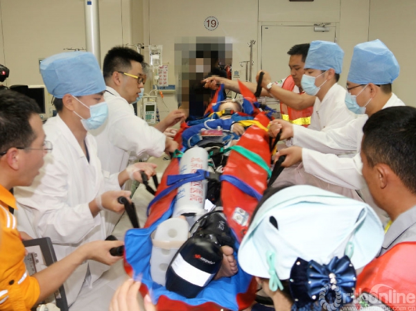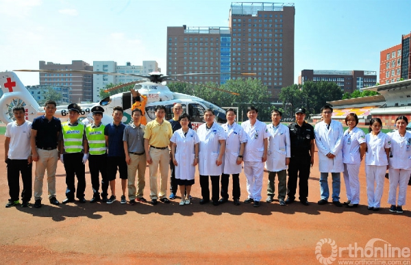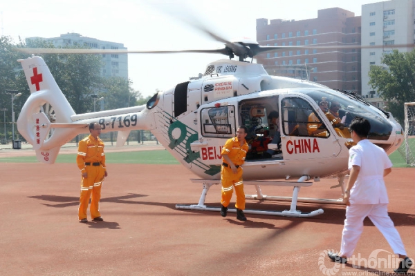 2016年7月27日上午8时许,一名31岁登山爱好者,不慎从高处坠落,造成颈椎骨折、骨盆骨折、股骨骨折、肩关节骨折、中度颅脑损伤、蛛网膜下腔出血、多发肋骨骨折、腹腔实质脏器破裂,在北医三院延庆区医院初步救治后,发现病情危重,需要转运到80公里以外的北京大学第三医院进行进一步治疗。999急救中心接到任务后,立刻派出直升机进行空中转运。45分钟后,病人被送至北医三院急诊抢救室。