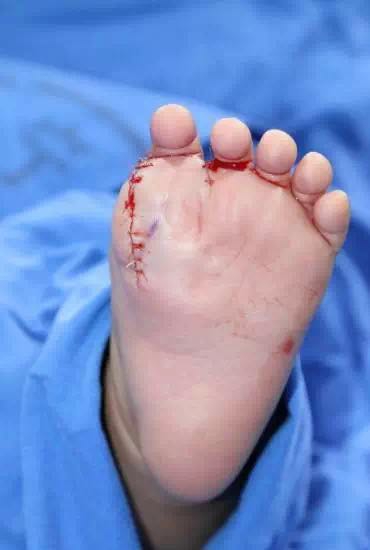 上周,弘弘的双脚手术在市六院进行,手术分成两个组,双脚的手术同时进行。1个多小时的手术时间里,医生为孩子切掉了多余的脚趾,并对脚趾的肌肉进行了再造。手术后弘弘的两只胖脚丫看上去和正常的孩子差不多了。