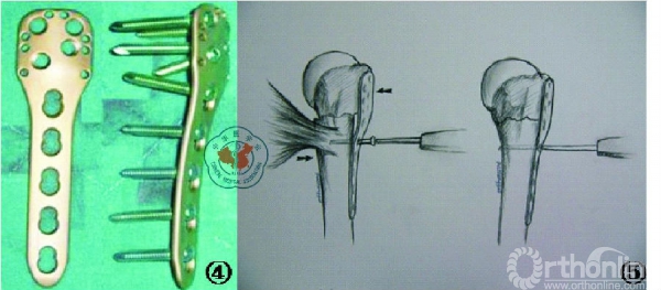 图5以肱骨近端内锁定系统(Philos)钢板为例,的滑动孔上打入3.5mm皮质骨螺钉,缓慢推进,使用螺钉的拉力作用使得移位的肱骨头克服胸大肌的牵拉至畸作用向接骨板靠拢,获得较为良好的复位。