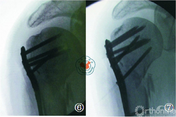 图7钢板固定后见内侧皮质不连续,肱骨近端骨折在内侧无嵌 插,属阴性支撑。经philos钢板“E”孔打入肱骨距螺钉,起内侧支撑作用。