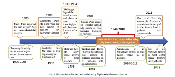 使用Mg材料作为骨科植入物的第一个临床研究可追溯到100多年前。在1900年,为了重新获得或保留关节运动功能,Payr介绍了在接合关节成形术中使用镁板和片材的想法。这时候Lambotte已经对狗的Mg植入物进行了研究,但治疗结果并不能令人满意。在1906年,Lambotte进行了一项试验,以使用Mg板和铁螺钉固定人体的骨折。不幸的是,这种组合由于电化学反应导致Mg板的快速降解,因此因稳定性不足,对患者进行了再次手术。Lambotte还使用单纯Mg钉修复了4名儿童的髁上骨折,关节功能得到了完全恢复,没有任何并发症;虽然镁降解生成气体形成空腔,但这些空腔在几周后缓慢消失。Verbrugge使用Mg板和螺钉治疗儿童的骨干肱骨骨折,3周后,镁板完全降解,骨折线消失。1938年左右,McBride进行了一系列试验,探讨Mg产品的临床应用的潜力。根据Mg的降解特性,他设计了几种适合于使用Mg植入物的操作技术,此外,他认为Mg植入物更适合用作自体骨移植物的固定装置。在1940年,Maier使用由纺锤形Mg板制成的装置来固定两例病人肱骨骨折。第一个病人的愈合过程顺利;然而,因气体腔的连续形成,另一患者的手术后12天不得不移除植入物。这两例病例,Maier随访了14年,结果都恢复良好。1948年,Troitskii等报道了34例成功案例,使用了Mg-Cd合金制成的螺钉和板组合。Mg植入物的完全降解被而新骨成功长入。由于Mg金属的降解会产生OH-离子并导致微环境中的pH的增加,Troitskii等认为,将Mg植入炎症组织可能中和酸性环境,因此能刺激成骨组织组织的形成,还可使骨髓炎患者在使用基于Mg的植入装置之后恢复更快。尽管基于Mg的植入物在肌肉骨骼疾病的手术治疗中潜力巨大,但由于其耐腐蚀性差,在大规模临床试验中使用Mg基矫形装置之前仍需要进行更多的努力。因此,开发具有恰当降解速率的Mg基内植入材料仍然存在挑战。