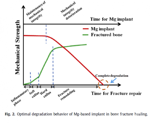 基于镁(Mg)的植入物相对于标准的永久性金属植入物的主要优点之一是拥有生物降解性。Mg可以通过体内腐蚀而降解,腐蚀源于其相对于正常氢电极(NHE)的-2.372V的标准电极电位,具有这种低标准电极电位的金属可以在水溶液中形成氢氧化镁[Mg(OH)2]和相同摩尔量的氢气(H2)。中间腐蚀产物可以通过与Cl-反应被吸收或代谢为Mg2+形式存在体液中或被巨噬细胞吸收。除了其生物化学特征和功能,Mg具有接近皮质骨的适当的机械强度,可以通过减少应力遮挡来解决骨折部位的愈合不良或再骨折问题。更重要的是,Mg植入物已被广泛报道可以刺激新骨形成,这有非常利于骨折愈合。总之,基于Mg的矫形装置可以在可以在体内控制降解。拥有机械性和生物学方面的优势。