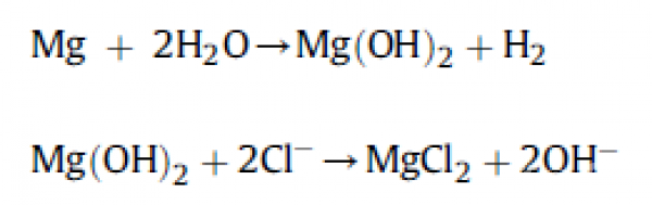 已知Mg金属在水性环境中经由电化学反应降解,其产生Mg(OH)2和H2。Mg(OH)2沉积在Mg基体上作为可作为保护层,但当环境中的氯离子(Cl-)浓度达到高于30mmol,Mg(OH)2开始转化为高度可溶性氯化镁(MgCl2)。因此,可以在体内的Mg上观察到连续腐蚀,其中体液的氯化物含量为约150mmol。Mg金属在含水条件下的降解机理可以通过以下化学反应来说明: