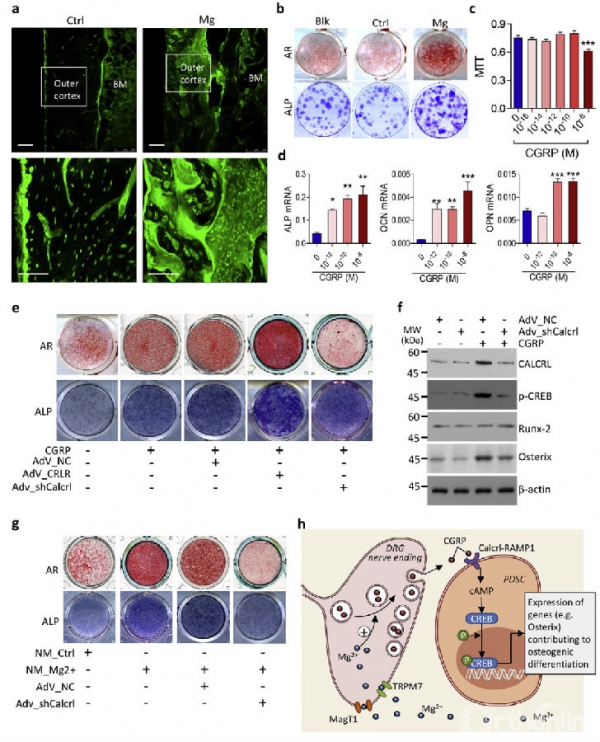 Mg植入物对骨生长的优点已经在各种动物模型中通过CT,荧光成像和组织学分析得到验证。据报道,由植入物释放的Mg离子诱导的骨膜反应有助于在皮质骨的外的骨形成,通过在背根神经节(DRG)中的Mg离子的刺激作用,降钙素基因相关肽(CGRP)在骨膜中的表达上调,这一结果已经在实验研究中报道。通过手术切除骨膜或使用shRNA敲除促成Mg离子的成骨作用的CGRP受体[降钙素受体样受体(Calcrl)或受体活性修饰蛋白(RAMP1)]后成骨作用大大减弱。结果表明,大鼠中的Calcrl或RAMP1的过表达显著增强了Mg植入后围绕骨膜的新骨形成。CGRP水平的增加(在Mg离子存在下将CGRP加入培养基或DRG的条件培养基)可以提高成骨分化能力。
