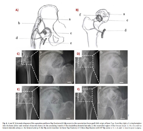 2013年,在中国,赵等使用专门设计的高纯Mg螺钉固定带血管蒂骨瓣治疗(ARCO)II/III期股骨头坏死。在12个月的随访期间,用高纯Mg螺钉固定移植骨瓣,取得更加令人满意的治疗结果(Mg组n=23,对照组n=25)(使用Harris髋关节评分(HHS)及x线片评估)。这是中国第一次临床试验,极大地促进了纯Mg基螺钉在ONFH重建手术中的应用,加速纯镁螺钉产品注册过程。这种HPMg螺钉的创新设计最近也被中国FDA(CFDA)在2015年评为创新医疗设备奖。这些治疗结果激励赵及其团队寻找不同骨折适应症的患者。详细的治疗结果总结在表3中作为参考和未来的系统性临床试验。