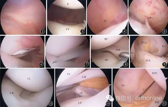 图2前外侧通道置入关节镜,伸直膝关节,见髌上囊正常滑膜;图3前外侧通道,镜下见膝关节伸直位髌股关节,P:髌骨;FT:股骨滑车;图4前外侧通道,镜下见外侧沟(LG)滑膜正常;图5前外侧通道,内侧沟(MG)滑膜正常,髌内侧支持带显示有挫伤出血,内侧髁软骨损伤;图6前外侧通道镜头监视下,针头辅助创建前内侧通道;图7 前外侧通道入关节镜,11#刀片同样方式扩大创口辅助创建前内侧通道;图8前外侧通道,内侧半月板形态、张力正常MC:内侧股骨髁;MP:内侧平台;MM:内侧半月板;图9前外侧通道显示正常的髁间窝结构,可用探钩测试交叉韧带张力ACL:前交叉韧带;PCL:后交叉韧带;MC:内侧股骨髁;LC:外侧股骨髁;图10前外侧通道,外侧间室见外侧半月板边缘显示轻度毛糙LC:外侧股骨髁;LP:外侧平台;LM:外侧半月板图11前内侧通道,从前外侧通道置入探钩拉起外侧半月板后角,见外侧间室后侧结构的正常腘肌腱裂孔和腘肌腱LC:外侧股骨髁;LM:外侧半月板;PT:腘肌腱;LP:外侧平台;图12 经前外侧通道置入关节镜,在后交叉韧带和股骨内侧髁之间进入后内侧关节囊,在关节镜监视下,使用针头辅助创建后内侧通道MPC:内侧后髁;MM:内侧半月板;PC:后关节囊;LN:定位用腰穿针