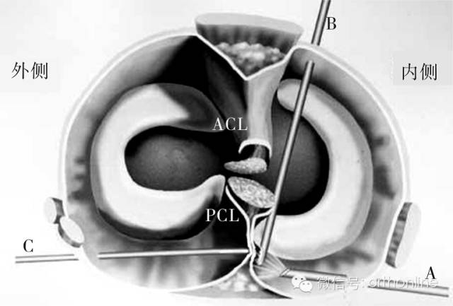 图13膝关节镜下建立跨后纵隔通道示意图 后内侧通道置入关节镜,经后外侧通道置入交换棒顶起后纵隔,经前内侧通道置入刨刀进行后纵膈开窗操作A:关节镜头;B:刨刀;C:交换棒;ACL:前交叉韧带;PCL:后交叉韧带