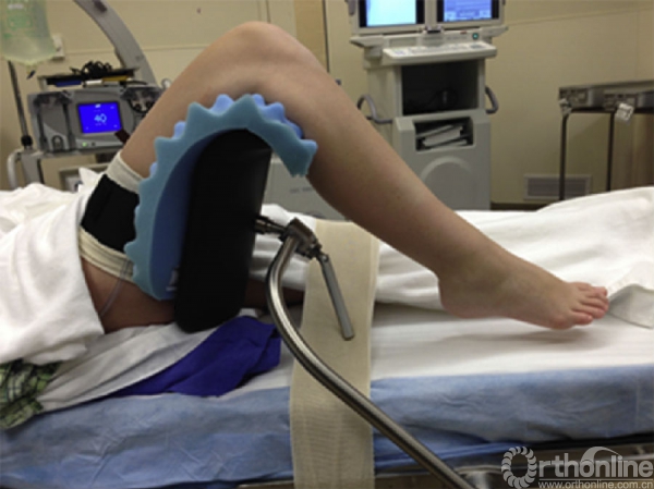 图3.仰卧位时,在大腿近端下放置沙袋来抵抗踝关节牵引器的张力并保持手术肢体的旋转中立位.