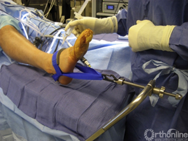 图1.仰卧位下行前入路踝关节镜时使用的腿部固定器.