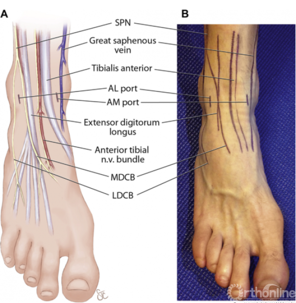 图5.前路踝关节镜入路及重要解剖结构的位置(A)示意图(B)体表标记.(AL port,前外侧入口;AM port,前内侧入口;LDCB,腓浅神经的足背外侧皮神经分支;MDCB,腓浅神经的足背内侧皮神经分支;n.v.,神经血管的;SPN,腓浅神经)