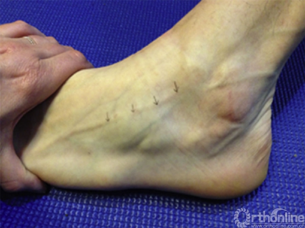 图6.通过跖屈、内翻踝关节来寻找并标记腓浅神经的分支——足背中间皮神经,前外侧入路位置应选择此结构的内侧.