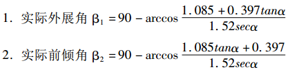 将上述步骤简化成坐标图,设冠状面为C,矢状面为S,髋臼轴为A,骨盆旋转后矢状面为S',C与S垂直,A与C成角为前倾角a = 15°,A与S成角为外展角b =45°,骨盆前旋转角度定义为+α,后旋转角度定义为-α。运用解析几何原理,两个向量夹角余弦公式,经过推导,可以得出如下公式: