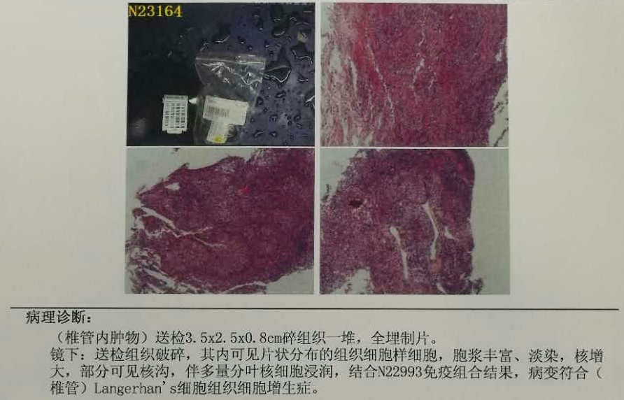 于患者使用抗生素后第5天行胸9病灶清除、病椎切除+内固定术。术后病理示:Langerhans细胞组织细胞增生症。