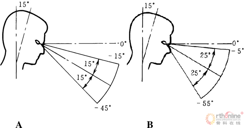 正常人垂直方向视野范围较大,满足这种视野范围需要寰枕关节运动、颈椎屈伸活动、眼球垂直运动结合整个躯干、下肢活动而实现。AS患者由于脊柱强直,严重者颈椎甚至寰枕关节活动受限,因而视野范围大大缩小,而视野范围对于患者生活工作十分重要,也是许多患者就诊的主要原因。人体不同状态下垂直视野范围如下图。