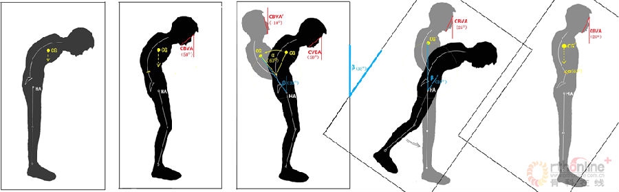颏眉角(chin-brow vertical angle,CBVA)是反映AS患者视野状态的重要指标,CBVA的测量应在患者站立位髋膝关节伸直下眉心与下颌中点连线与铅垂线的夹角。CBVA随着后凸矫形而变化,如下面示意图。