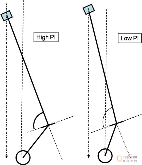 骨盆映射角(pelvic incidence,PI)正常在成年后恒定不变,文献报道PI值与AS单节段腰椎截骨矫形术后矢状位失衡有较大的相关性,高PI值对AS患者畸形的影响如下示意图所示。