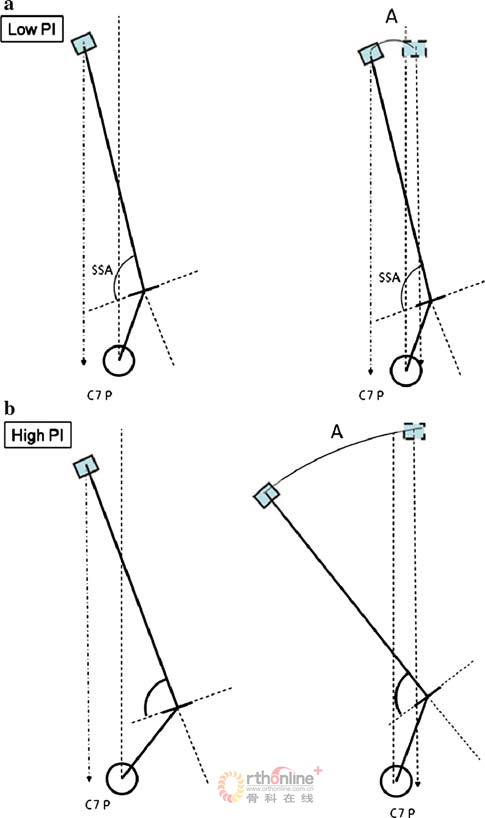 图9 上 高PI值患者矢状位失衡更加明显; 下 高PI值患者实现矢状位平衡需要的截骨角度也较大