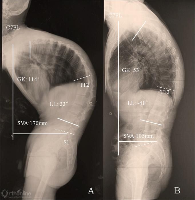 (图片资料摘自Debarge等Radiological analysis of ankylosing spondylitis patients with severe kyphosis before and after pedicle subtraction osteotomy, Eur Spine J, 2010, 19(1):65-70.)