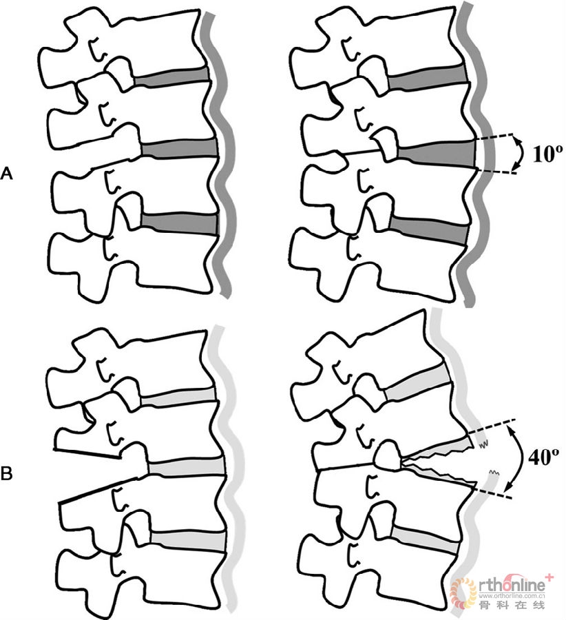 (图片资料摘自Liu等Comparison of Smith-Petersen Osteotomy and Pedicle Subtraction Osteotomy for the Correction of Thoracolumbar Kyphotic Deformity in Ankylosing Spondylitis, Spine (Phila Pa 1976), 2015, 40(8):570-9.)