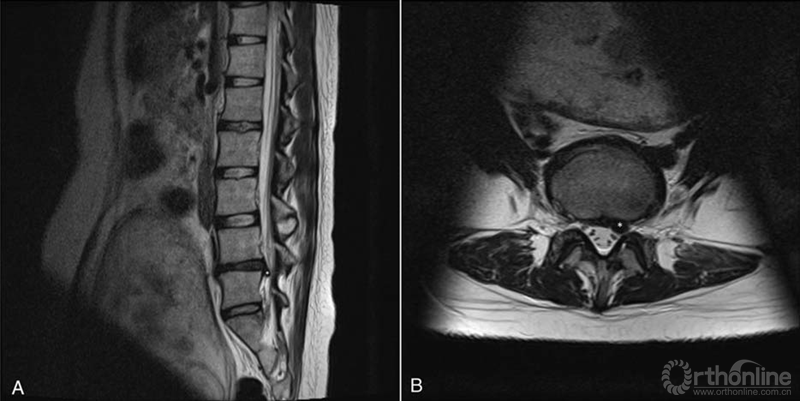 图1.术前20周孕龄腰椎MRI显示L4/5椎间盘突出(星号)和明确的神经根受压(箭头)(A)矢状位T2加权图像。(B)轴向T2加权像。