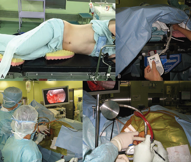 予以皮质类激素(1mg/0.5ml β-倍他米松+0.5ml 1%利多卡因)进行左侧L5神经根阻滞仅暂时缓解疼痛。外科医生与麻醉医生、妇产科医生和新生儿科医生进制定了详细的手术方案,术中患者采用左侧卧位,以便胎儿监护和应对胎儿窘迫事件。最终,该名24周孕龄高龄产妇在全麻下经椎板间入路完成MED手术(图2A- D)。手术期间胎儿监测未示明显异常。