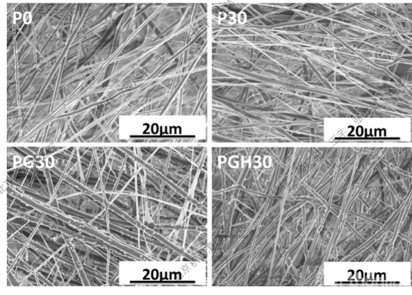 对PGH30,我们采用将微量的醋酸加入PCL与明胶的混合电纺液中,混合均匀后在室温下放置24小时后电纺液仍然能够保持透明均匀的状态,因此得到的纳米纤维也非常平滑且直径分布均匀。