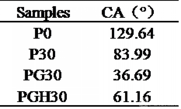 图2为水滴落在膜表面5秒后的形态照片,静态水接触角(Contact angle,CA)值见表2。随MNA及明胶的加入,CA变小。由此可见MNA及明胶的引入均能够显著提高膜的亲水性能。虽然PG30与PGH30中明胶含量基本相同,但PGH的水接触角却明显大于PG30,亲水性能略有下降。
