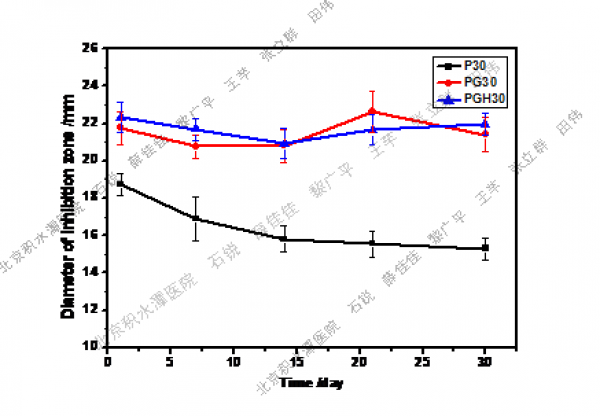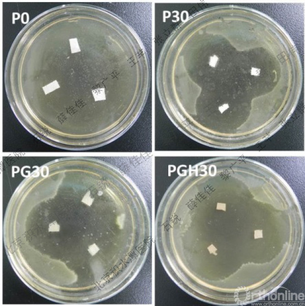 抑菌试验用来检测在相同载药量下,不同材料组成对于抑菌性能的影响。由于明胶降解速率非常快,因此共混材料中明胶相所含药物会迅速扩散至培养皿中,因此含明胶的样品PG30与PGH30的初始抑菌活力要高于P30。此外由于明胶分子上的亲水基团要多于PCL分子上的亲水基团,因此,更多的药物分子存在于明胶相中。因此PG30和PGH30释放的药物总量要多于P30,抑菌效果更明显。