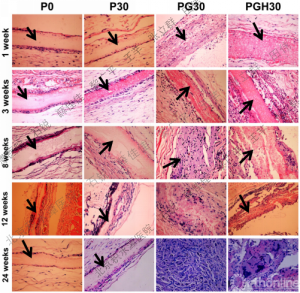 术后24周,P0及P30明显变薄,但完整性及细胞屏蔽性能保持良好。PG30和PGH30的纳米纤维的结构完全消失,材料近乎被细胞完全吞噬。